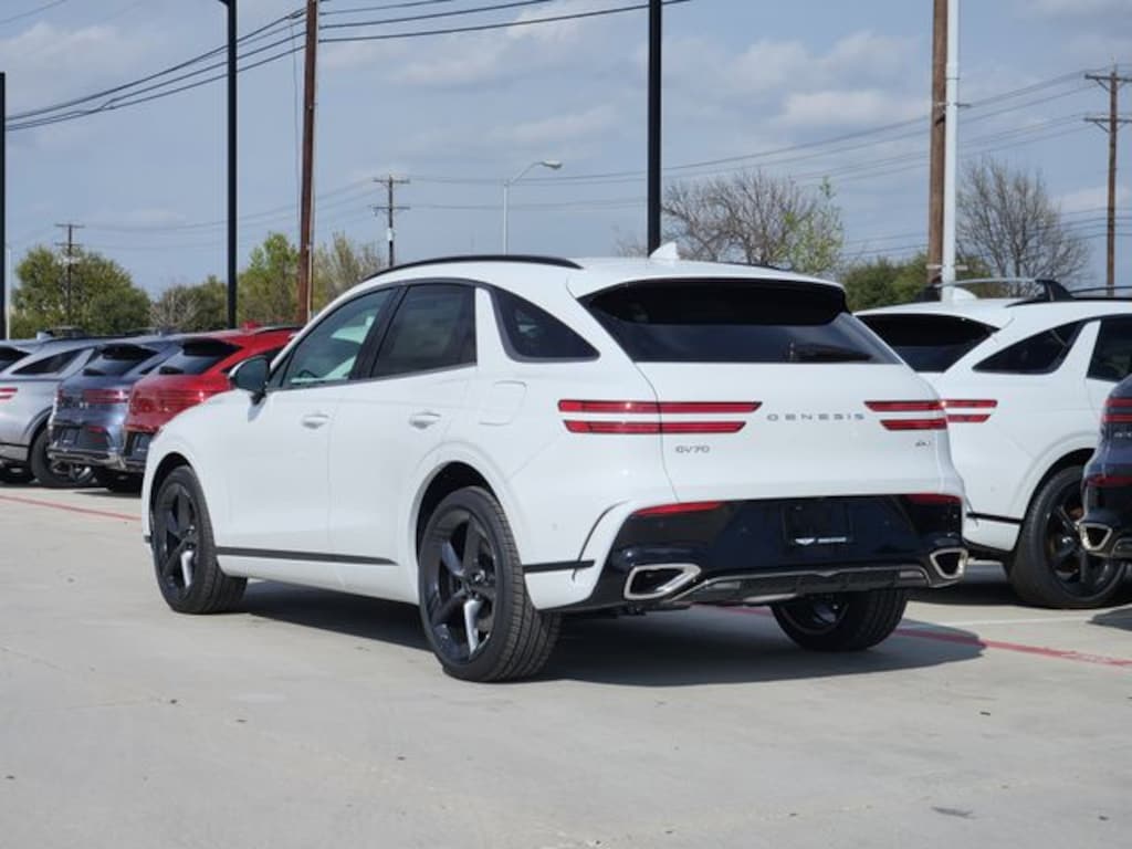 Alta White 2026 Genesis GV70 2.5T Sport Prestige 4D Sport Utility 2.5T Sport Prestige AWD 8-Speed Automatic with SHIFTRONIC 2.5L DOHC 16 Speakers, 4-Wheel Disc Brakes, ABS brakes, Air Conditioning, Alloy wheels, AM/FM radio: SiriusXM, Android Auto & Apple CarPlay, Anti-whiplash front head restraints, Auto High-beam Headlights, Auto-dimming door mirrors, Auto-dimming Rear-View mirror, Automatic temperature control, Brake assist, Bumpers: body-color, Delay-off headlights, Driver door bin, Driver vanity mirror, Dual front impact airbags, Dual front side impact airbags, Electronic Stability Control, Emergency communication system: Genesis Connected Services, Exterior Parking Camera Rear, Four wheel independent suspension, Front anti-roll bar, Front Bucket Seats, Front Center Armrest w/Storage, Front dual zone A/C, Front reading lights, Fully automatic headlights, Garage door transmitter: HomeLink, Heated and Ventilated Front Bucket Seats, Heated door mirrors, Heated front seats, Heated steering wheel, Illuminated entry, Knee airbag, Leather steering wheel, Low tire pressure warning, Memory seat, Navigation System, Occupant sensing airbag, Outside temperature display, Overhead airbag, Overhead console, Panic alarm, Passenger door bin, Passenger vanity mirror, Power door mirrors, Power driver seat, Power Liftgate, Power moonroof, Power passenger seat, Power steering, Power windows, Radio: 14.5" Navigation System with AM/FM/HD, Rain sensing wipers, Rear air conditioning, Rear anti-roll bar, Rear reading lights, Rear seat center armrest, Rear window defroster, Rear window wiper, Remote keyless entry, Security system, Speed control, Speed-sensing steering, Speed-Sensitive Wipers, Split folding rear seat, Spoiler, Sport Leather Seating Surfaces, Steering wheel memory, Steering wheel mounted audio controls, Tachometer, Telescoping steering wheel, Tilt steering wheel, Traction control, Trip computer, Turn signal indicator mirrors, Variably intermittent wipers, Ventilated front seats, and Wheels: 21" Dark Sputtering Alloy.