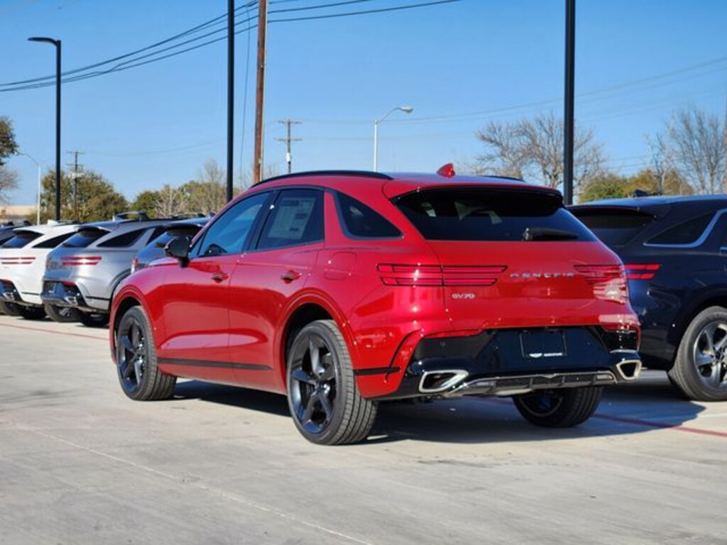 Red 2026 Genesis GV70 2.5T Sport Prestige 4D Sport Utility 2.5T Sport Prestige AWD 8-Speed Automatic with SHIFTRONIC 2.5L DOHC 16 Speakers, 4-Wheel Disc Brakes, ABS brakes, Air Conditioning, Alloy wheels, AM/FM radio: SiriusXM, Android Auto & Apple CarPlay, Anti-whiplash front head restraints, Auto High-beam Headlights, Auto-dimming door mirrors, Auto-dimming Rear-View mirror, Automatic temperature control, Brake assist, Bumpers: body-color, Delay-off headlights, Driver door bin, Driver vanity mirror, Dual front impact airbags, Dual front side impact airbags, Electronic Stability Control, Emergency communication system: Genesis Connected Services, Exterior Parking Camera Rear, Four wheel independent suspension, Front anti-roll bar, Front Bucket Seats, Front Center Armrest w/Storage, Front dual zone A/C, Front reading lights, Fully automatic headlights, Garage door transmitter: HomeLink, Heated and Ventilated Front Bucket Seats, Heated door mirrors, Heated front seats, Heated steering wheel, Illuminated entry, Knee airbag, Leather steering wheel, Low tire pressure warning, Memory seat, Navigation System, Occupant sensing airbag, Outside temperature display, Overhead airbag, Overhead console, Panic alarm, Passenger door bin, Passenger vanity mirror, Power door mirrors, Power driver seat, Power Liftgate, Power moonroof, Power passenger seat, Power steering, Power windows, Radio: 14.5" Navigation System with AM/FM/HD, Rain sensing wipers, Rear air conditioning, Rear anti-roll bar, Rear reading lights, Rear seat center armrest, Rear window defroster, Rear window wiper, Remote keyless entry, Security system, Speed control, Speed-sensing steering, Speed-Sensitive Wipers, Split folding rear seat, Spoiler, Sport Leather Seating Surfaces, Steering wheel memory, Steering wheel mounted audio controls, Tachometer, Telescoping steering wheel, Tilt steering wheel, Traction control, Trip computer, Turn signal indicator mirrors, Variably intermittent wipers, Ventilated front seats, and Wheels: 21" Dark Sputtering Alloy.